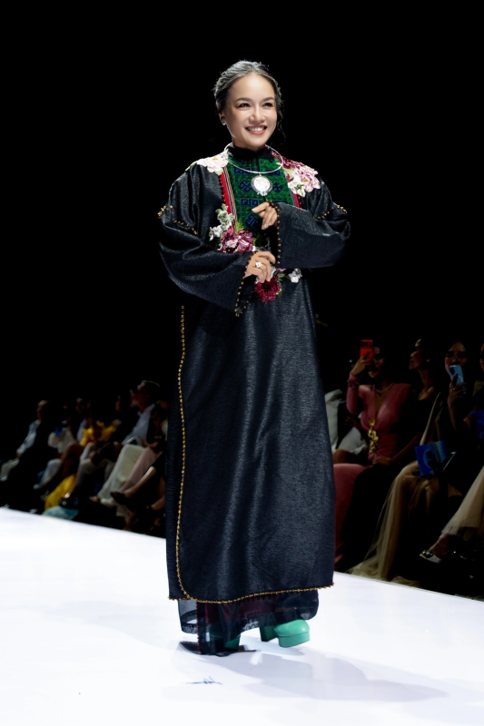 Nghệ sĩ Tú Oanh, 57 tuổi, mang giày cao gót 9 cm, trình diễn áo dài đính thổ cẩm và thêu hoa. Trước đó, cô từng catwalk lần đầu ở tuần lễ thời trang năm ngoái.