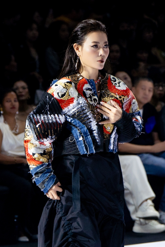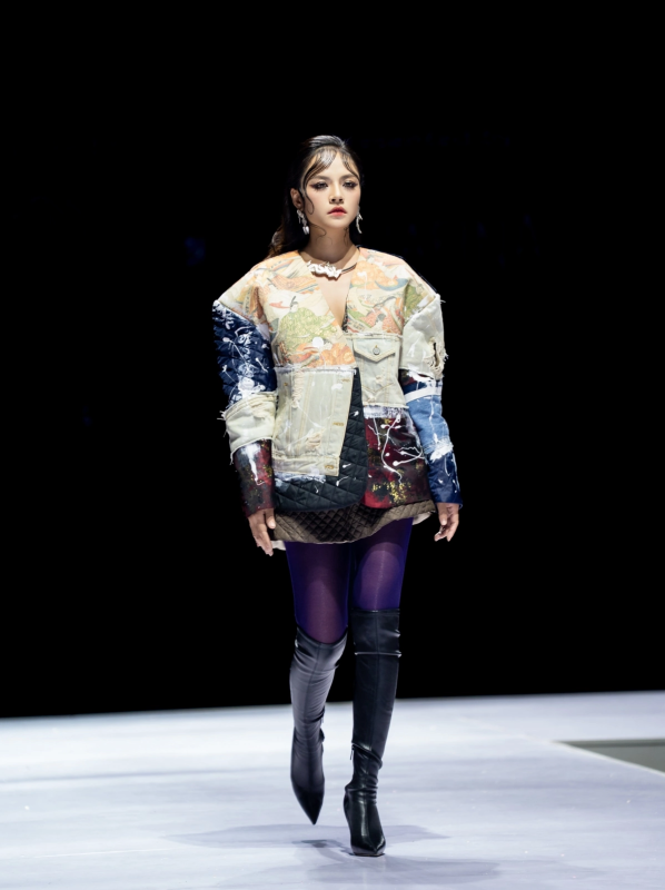 Diễn viên Thu Quỳnh catwalk với áo khoác quá khổ chắp vá theo phong cách tái cấu trúc.