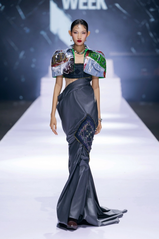 Ở vị trí mở màn, người mẫu Huỳnh Tú Anh mang đến bộ đầm cut-out, nhấn bằng phần quây ngực làm từ vải thổ cẩm, kết hợp áo khoác chắp vá.